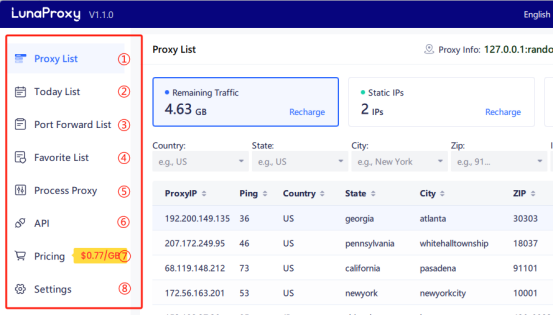 ⑦ Price: Dynamic residential proxy, static residential proxy, and static data center purchase interface