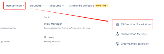 Log in to lunaproxy official website, and click Usage Settings →S5 Download to download automatically.