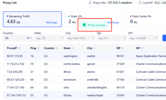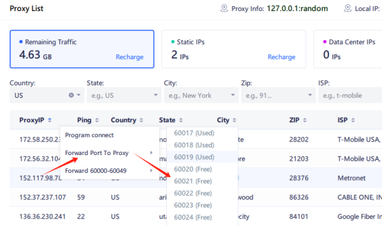 3. Place the mouse on the IP to be used, right click, click the connection port, select the port to be used and click, and the proxy will be prompted to succeed after connection.