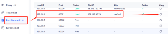 4. Click on the port forwarding list to see the connected IP port information, and click Copy to configure it in the configuration tool.