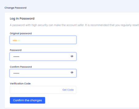 2. Enter your original password, new password and confirm the new password, then click [Get Verification Code]. Your registered email address will receive a verification code email. After entering the verification code, click Confirm the modification and the modification will be successful.