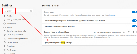 2. Search for "proxy" in the upper left corner and click "Open your computer proxy settings" in the search results on the right