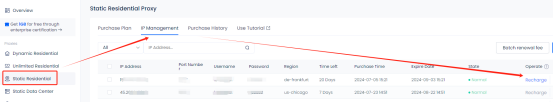 例如,一位用戶購買了30天的靜態住宅代理,想再次續費30天,如圖所示,首先進入靜態住宅的IP管理界面,點擊IP右側對應的續費按鈕