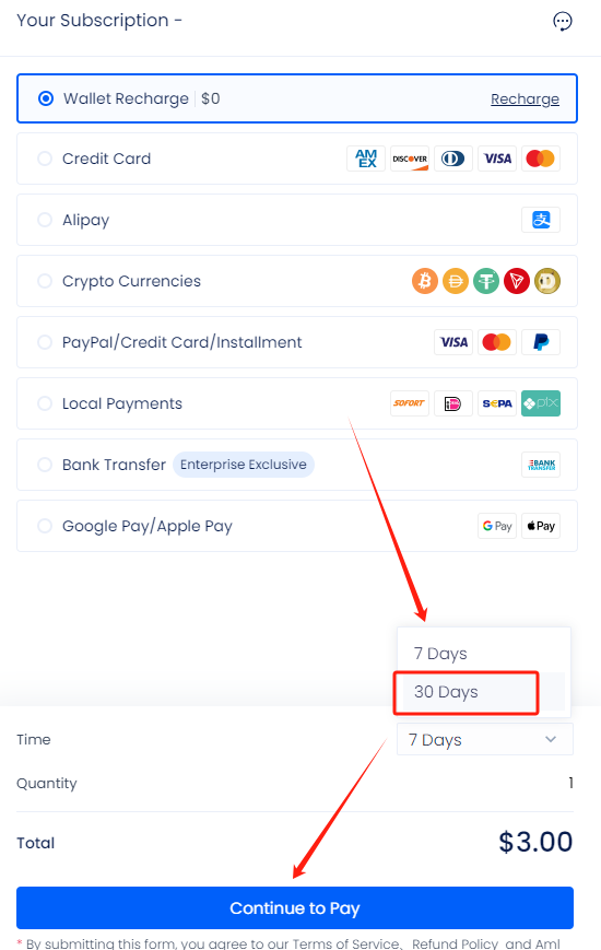 不限量住宅代理是按照時長收費,如果需要延長有效期,直接購買對應時長即可,例如,想延長30天,可以直接購買30天的不限量住宅代理